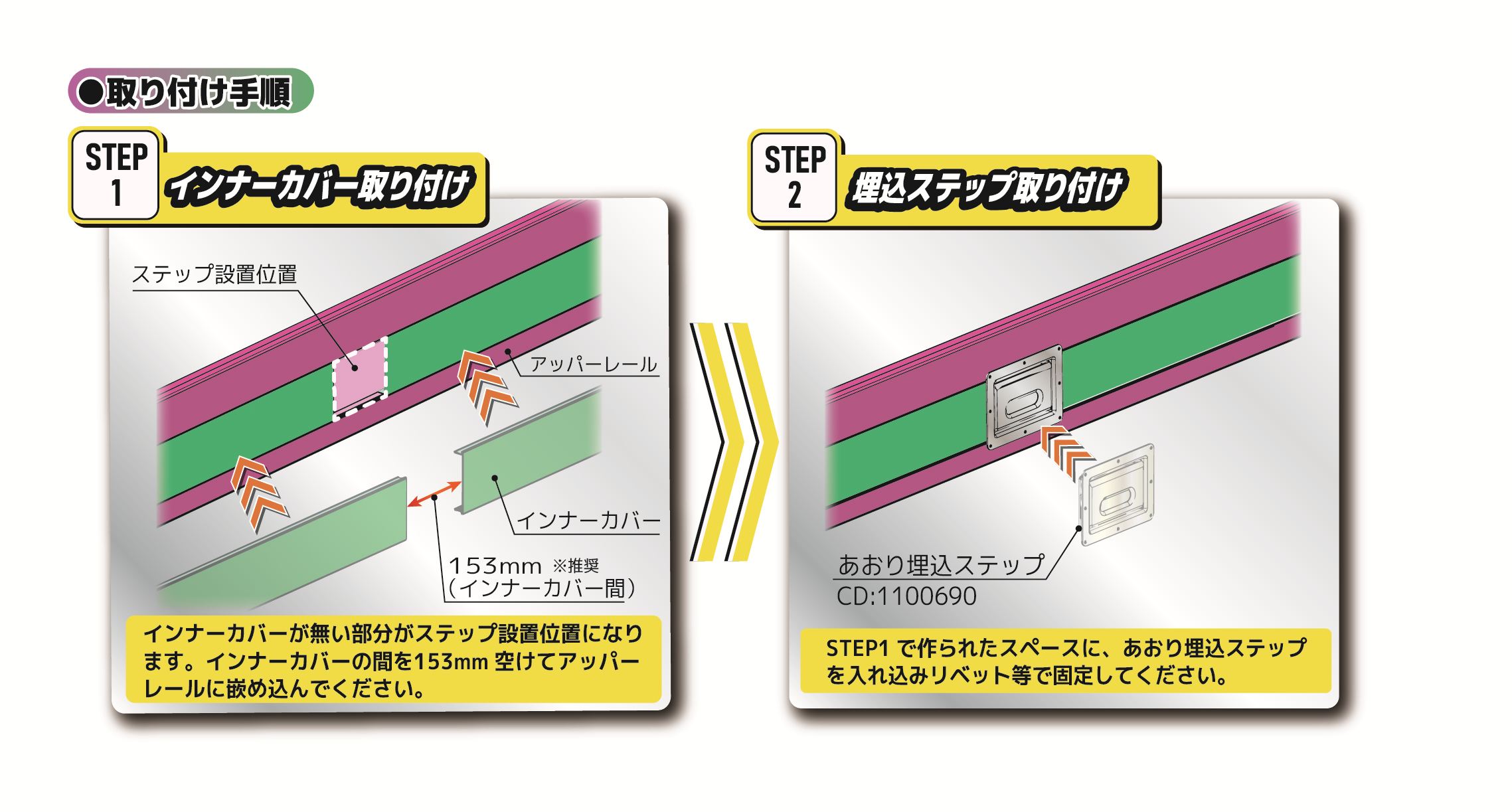 ●JB埋込ステップ用あおり●インナーカバーの長さ調整のみで、容易にステップ 埋込スペースを作ることができます。●あおり本体を削る必要が無い為、工数削減や失敗リスク の削減ができます。●ステップの設置位置を自由に決めることができます。 ※長手方向のみ