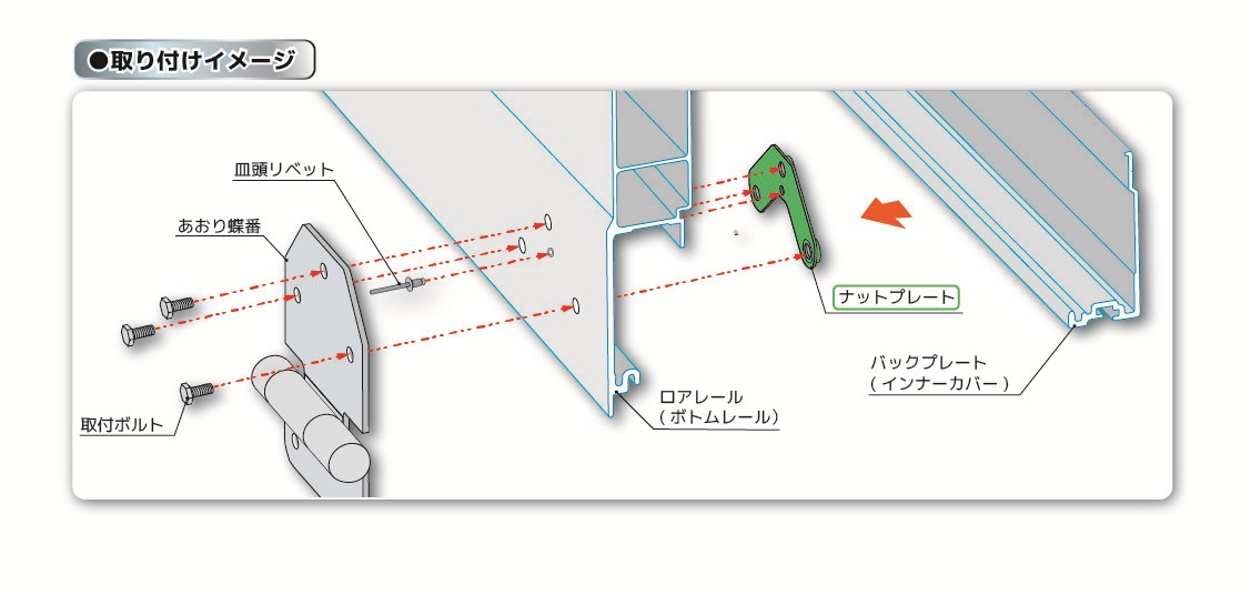 ●バックプレート仕様のロアレールに、あおり蝶番を取り 付けるためのナット付プレートです。ナットとプレート が一体化している為、効率良く蝶番を取り付けることが できます。●プレート本体固定穴を利用し、皿リベット等であおり側 に固定することで蝶番交換時にボルトを外した際プレー ト本体が脱落しません。その為バックプレートを取り外 すことなく蝶番の交換が可能になります。