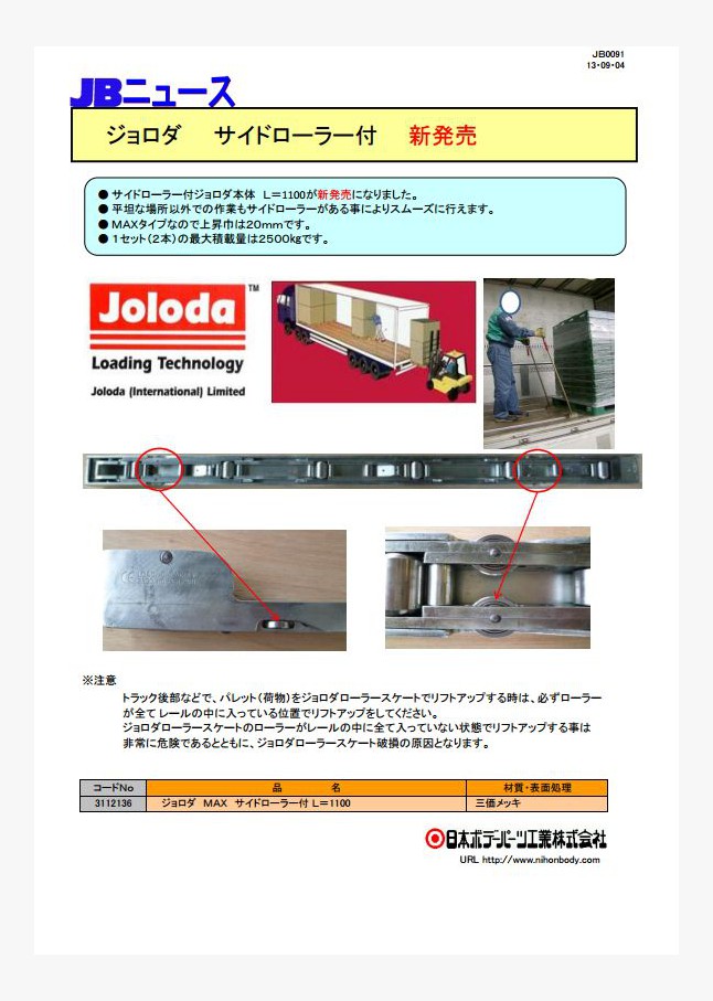 アルミ製ジョロダ本体 フラットタイプ L=1100用が新発売になりました。ジョロダ・ハイドラロール社、初となるフラット構造のアルミ製ローラースケートです。パレットの下をくぐらせて引き出すことができ、安全で効率の良い連続作業が可能です。