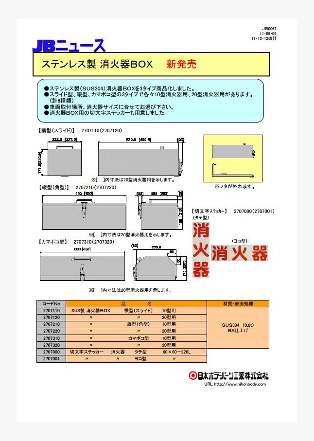 ステンレス製(SUS304)消火器BOXを3タイプ商品化しました。