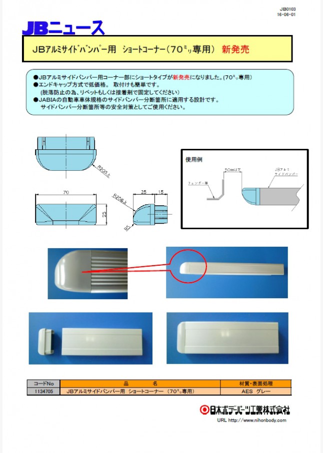 JBアルミサイドバンパー100H用のエンドキャップとショートコーナーが新発売になりました。サイドバンパー分断箇所の安全対策としてご使用ください。ショートコーナーはJABIA/自動車車体規格のサイドバンパー分断箇所に適合する設計です。
