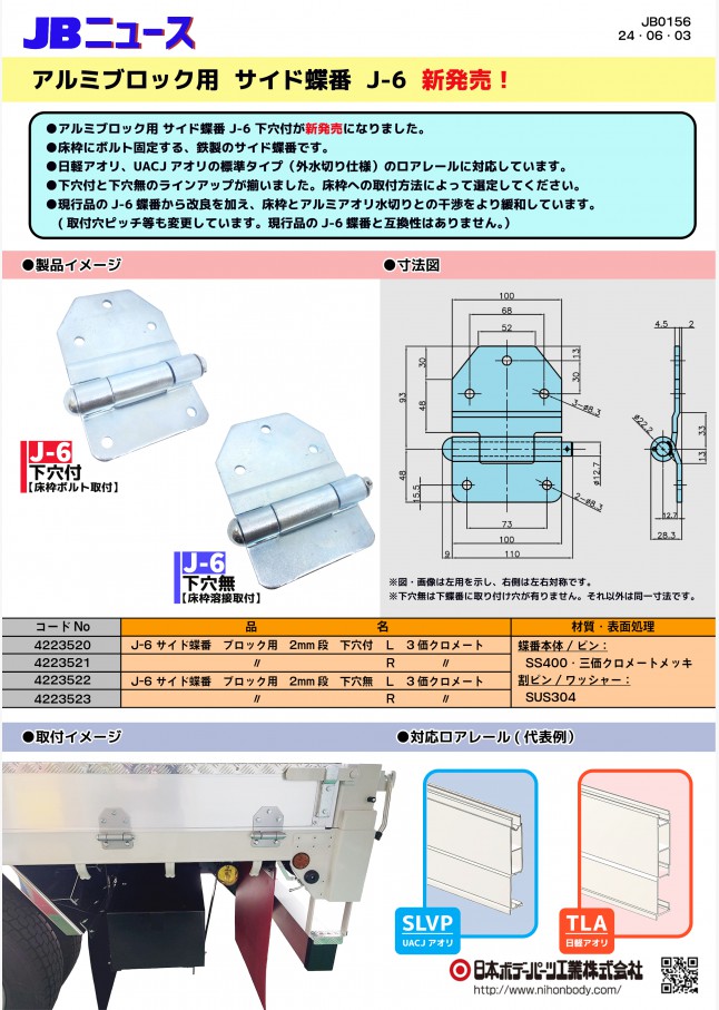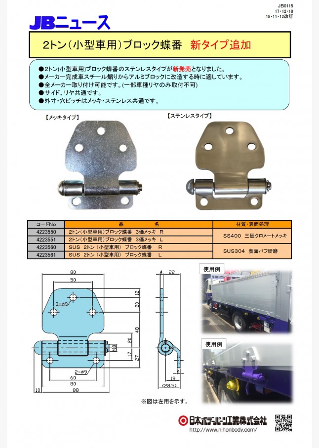 JB ステンレス バン扉蝶番 リヤー用・サイド用が仕様変更し、販売再開になります。リヤー用は大・小の2種類が入荷済、サイド用は2019年4月頃の発売予定です。