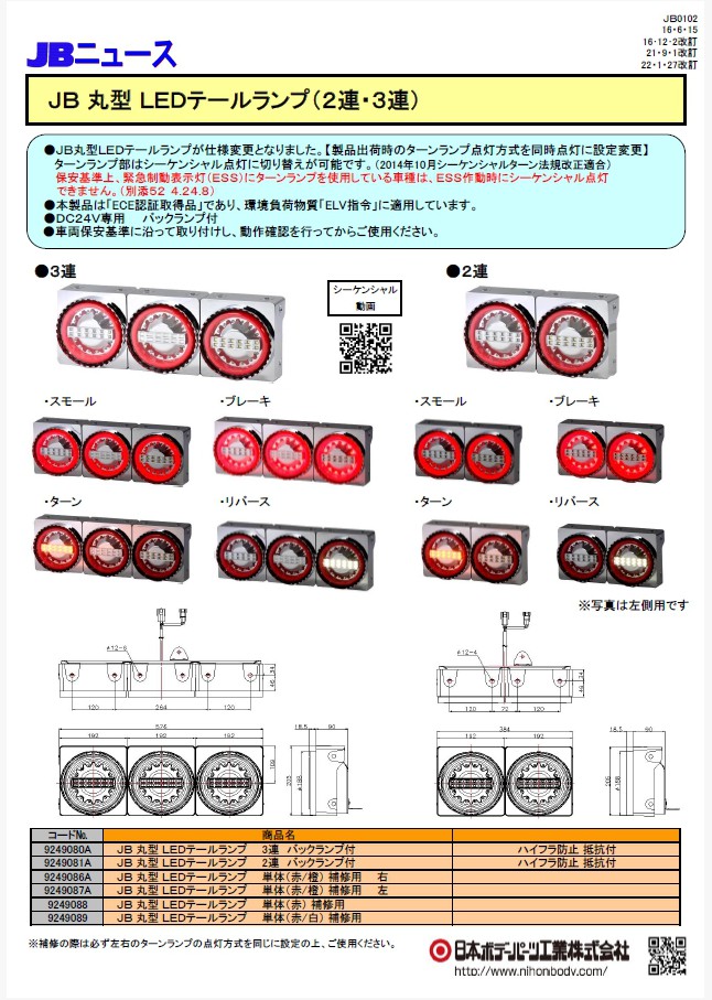 JB丸型LEDテールランプが仕様変更となりました。【製品出荷時のターンランプ点灯方式を同時点灯に設定変更】ターンランプ部はシーケンシャル点灯に切替が可能です。保安基準上、緊急制動表示灯(ESS)にターンランプを使用している車種には、ESS作動時にシーケンシャル点灯できません。(別添52 4.24.8)