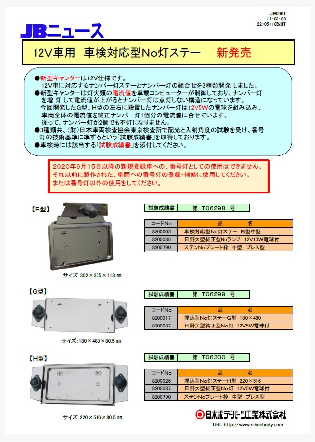 車検対応型No灯ステーA型大型用、A型中型用、BOX型大型用、BOX型中型用、A型ダンプ用大型用 がLEDナンバー灯(LSL-1009AV)に対応するようになりました。(旧基準対応品の為、2020年9月15日以降の新規登録車への、番号灯としての使用はできません。)