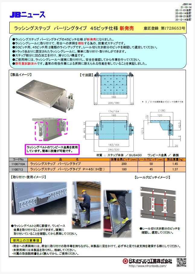 ラッシングレールに取り付けて、荷台への昇降を補助する為の、脱着式ステップです。ラッシングベルトのワンピース金具を使用しており、簡単に脱着が可能です。耐荷重試験にて、通常の荷役作業による昇降に耐えられる性能を有していることを実証しました。レール切り欠き穴のピッチ【45mm】の対応品が新発売されました!
