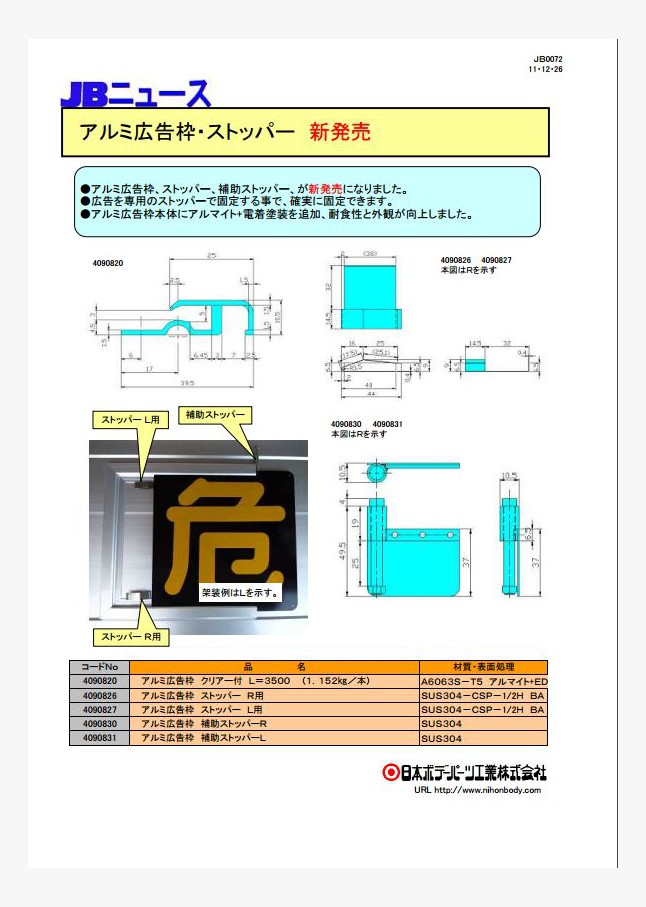 アルミ広告枠、ストッパー、補助ストッパー、が新発売になりました。