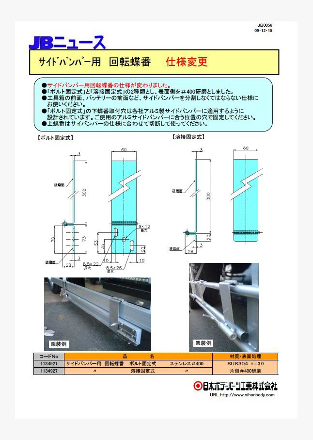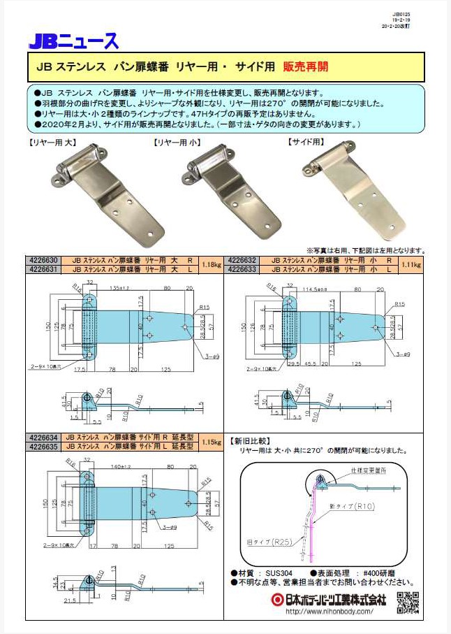 JB ステンレス バン扉蝶番 リヤー用・サイド用が仕様変更し、販売再開になります。リヤー用は大・小の2種類が入荷済、サイド用は2019年4月頃の発売予定です。
