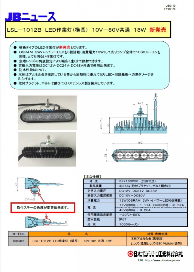 JB0110 LED作業灯 横長タイプ LSL-1012B 新発売!