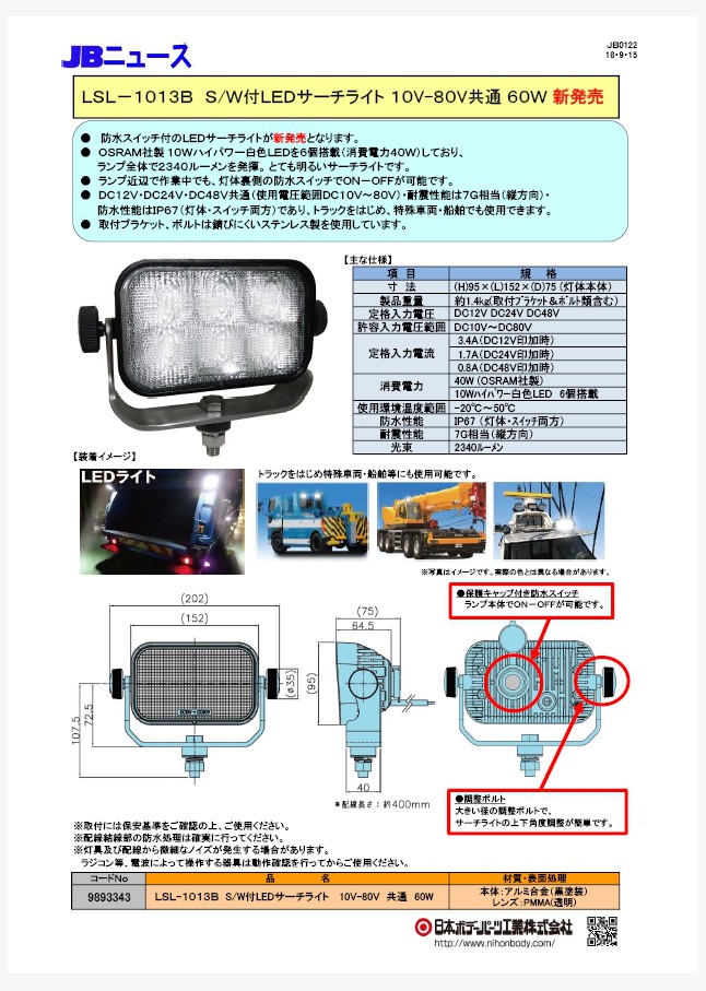 JB0122 スイッチ付LEDサーチライト LSL-1013B 新発売!