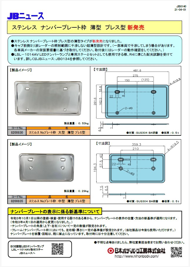 JB0140 ステンレスナンバープレート枠 薄型プレス型 新発売!