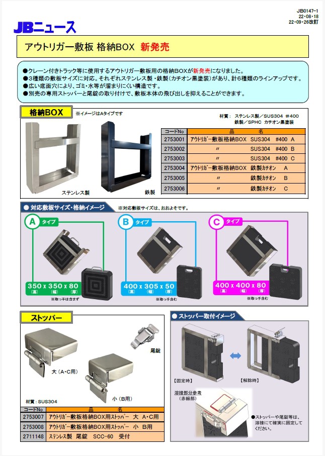 クレーン付きトラック等に使用するアウトリガー敷板用の格納BOXが新発売になりました。3種類の敷板サイズに対応。それぞれステンレス製・鉄製(カチオン黒塗装)があります。別売の専用ストッパーと尾錠の取り付けで、敷板本体の飛び出しを抑えることができます。