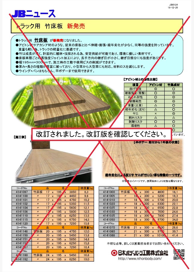 トラック用竹床板のサイズ一覧表です。アイテムの増減に伴い、竹床板のアイテムリストを更新しました。