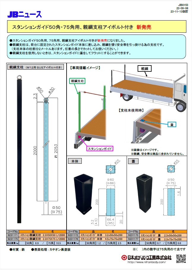 荷台に固定されたスタンションガイド本体に差し込み、親綱を張り安全帯を引っ掛けるための親綱支柱と、それに対応したスタンションガイド本体と蓋が発売になりました。
