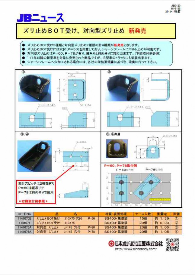 ズリ止めBOT受け(2種類)・対向型ズリ止め(2種類)が新発売となりました。溶接作業が原則禁止のシャーシフレームに対応。ボルト止めが可能です。