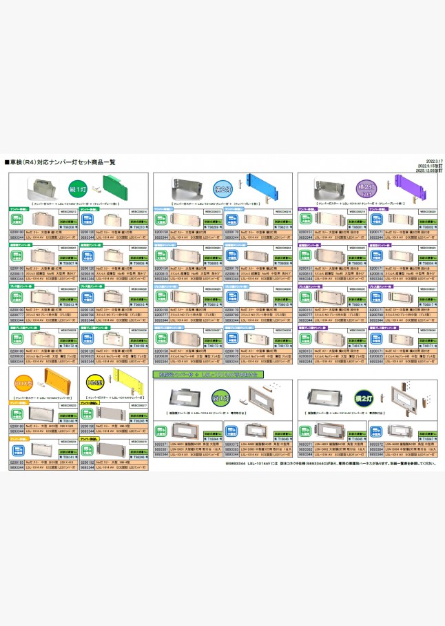 ECE認証ナンバー灯 LSL-1014AVを使用したセット商品の一覧表です。ナンバー灯ステー各種、樹脂製ナンバー枠+専用取付台各種、LSL-1014AV専用車種別ハーネス各種を掲載しています。商品の詳細についてはそれぞれのJBニュースをご確認ください。