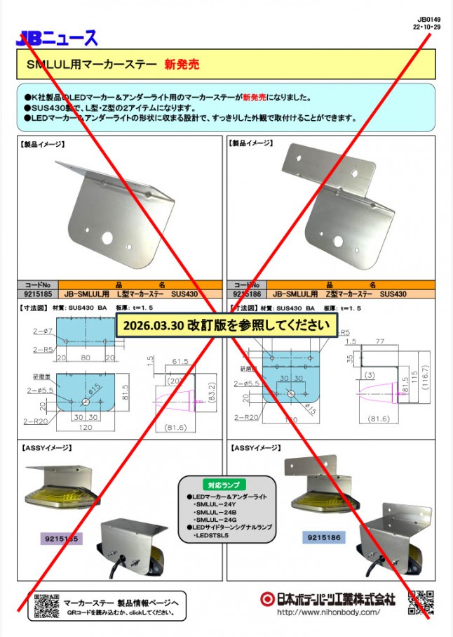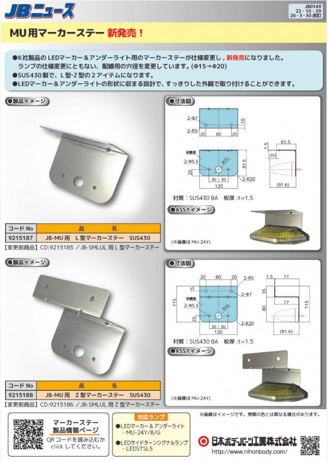 LEDマーカー&アンダーライト用のマーカーステーが仕様変更し、新発売になりました。ランプの仕様変更に伴い、配線用の穴径を変更しています。SUS430製で、L型・Z型の2アイテムです。すっきりとした外観で取り付けることができます。