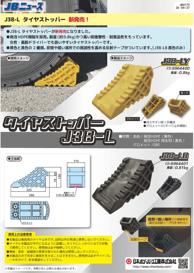JBアルミサイドバンパー100H用のエンドキャップとショートコーナーが新発売になりました。サイドバンパー分断箇所の安全対策としてご使用ください。ショートコーナーはJABIA/自動車車体規格のサイドバンパー分断箇所に適合する設計です。