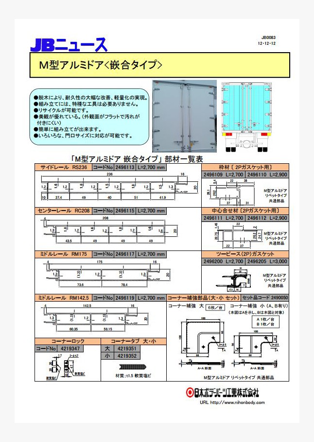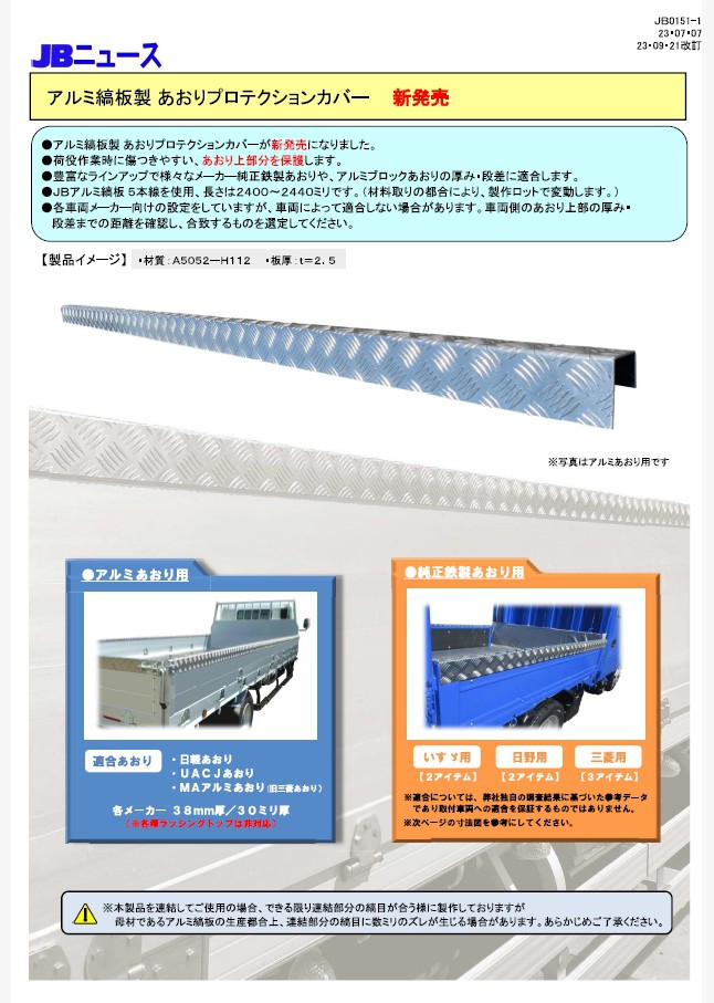 JBアルミサイドバンパー100H用のエンドキャップとショートコーナーが新発売になりました。サイドバンパー分断箇所の安全対策としてご使用ください。ショートコーナーはJABIA/自動車車体規格のサイドバンパー分断箇所に適合する設計です。