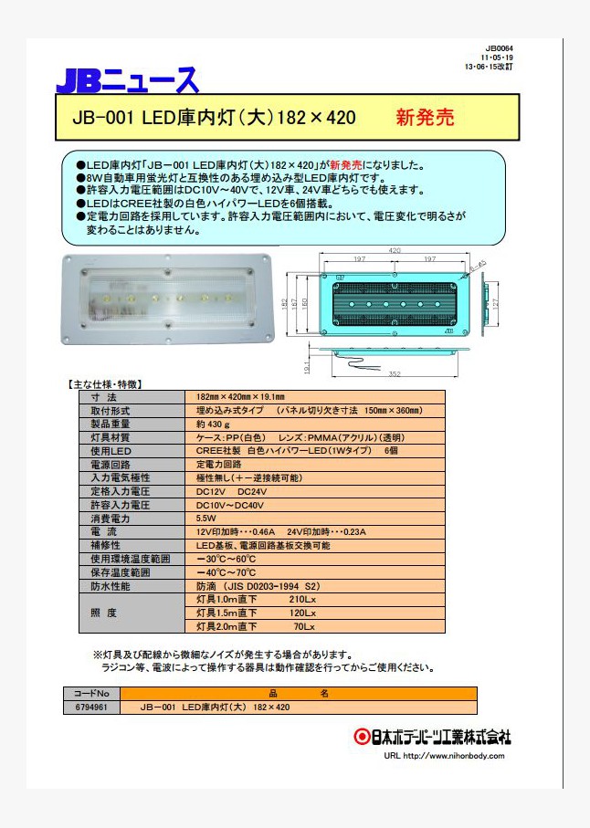 LED庫内灯「JB-001 LED庫内灯(大)182×420」が新発売になりました。