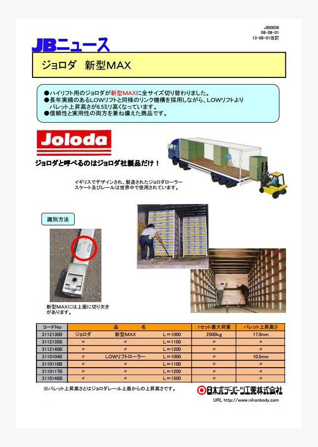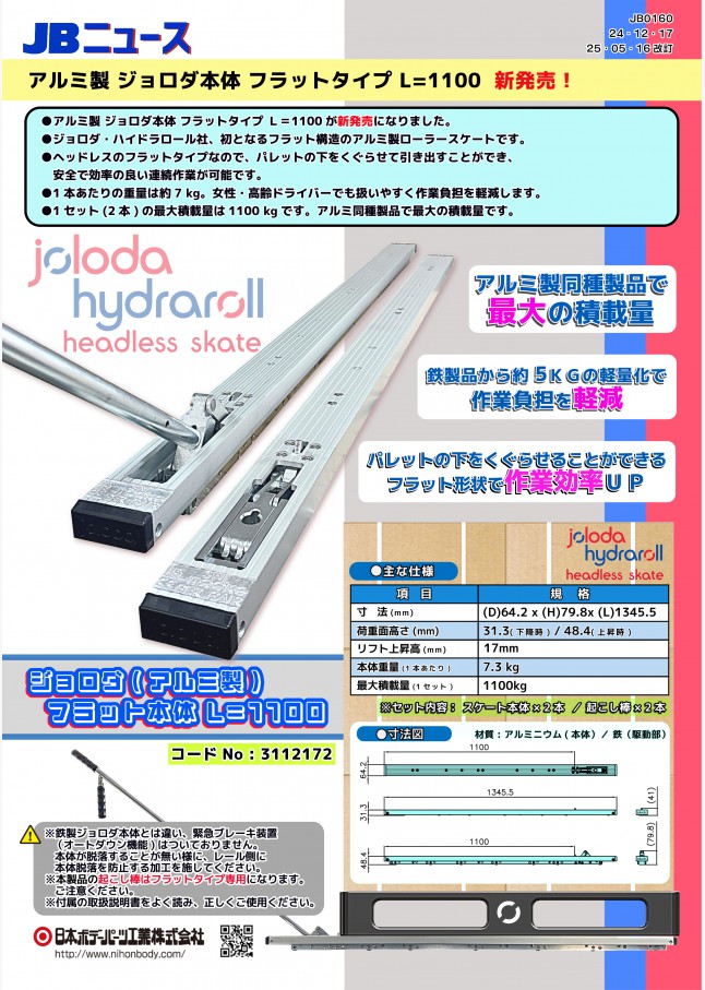 アルミ製ジョロダ本体 フラットタイプ L=1100用が新発売になりました。ジョロダ・ハイドラロール社、初となるフラット構造のアルミ製ローラースケートです。パレットの下をくぐらせて引き出すことができ、安全で効率の良い連続作業が可能です。