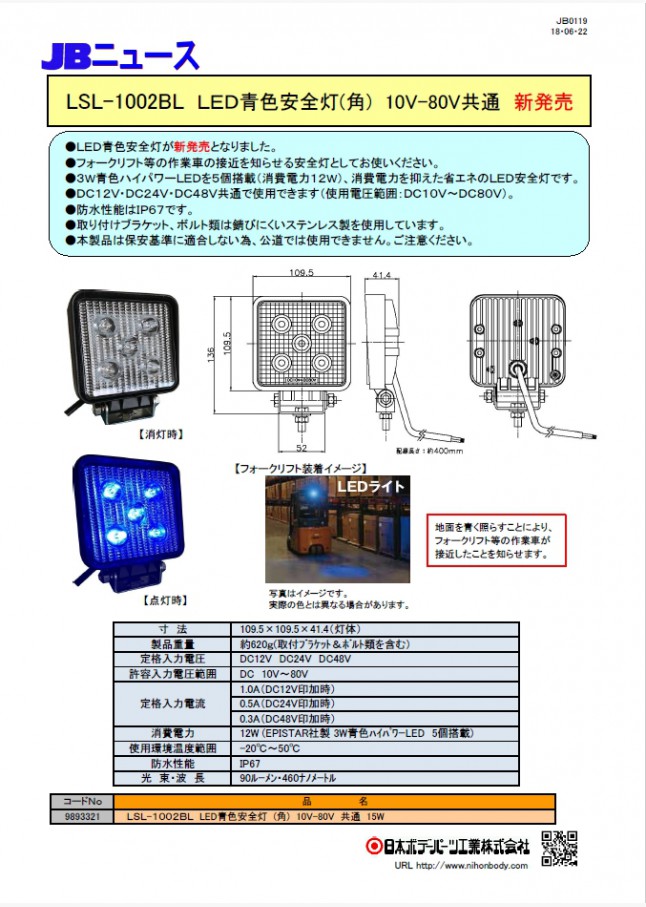 LED青色安全灯が新発売になりました。 フォークリフト等の作業車が接近したことを知らせます。(DC12V・24V・48V 共用)