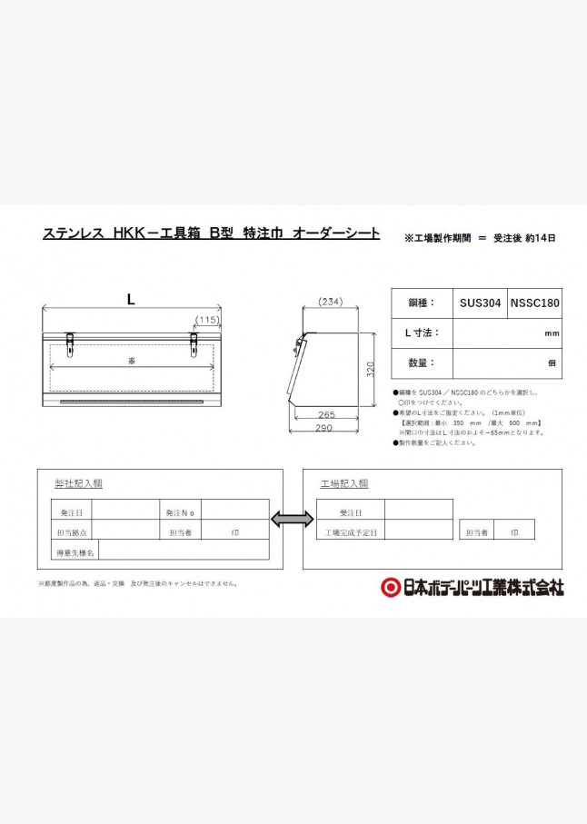 ※HKK型ステンレス工具箱 特注巾 B型オーダーシートダウンロード