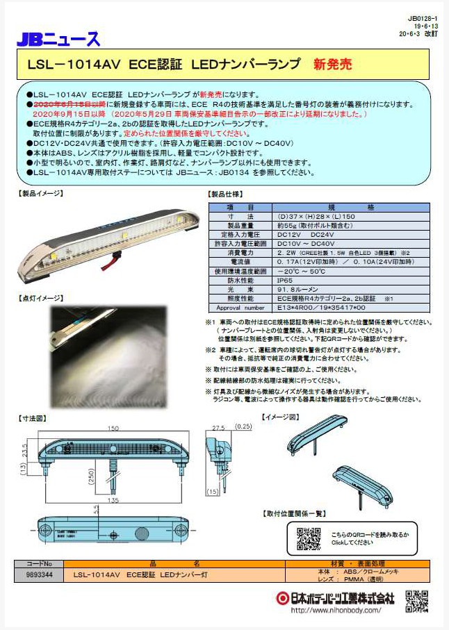 JB0128 LSL-1014AV ECE認証 LEDナンバー灯 新発売!