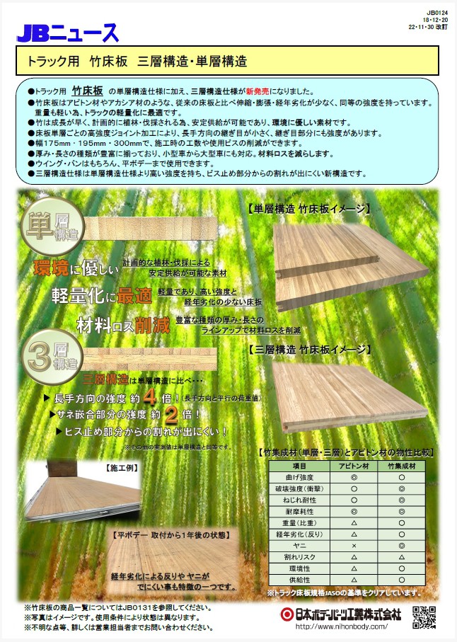 トラック竹床板の単層構造仕様に加え、三層構造仕様が新発売になりました。単層構造と比べ強度も高く、ビス止め部分からの割れが出にくい仕様になっています。三層構造仕様には大盤板もあります。