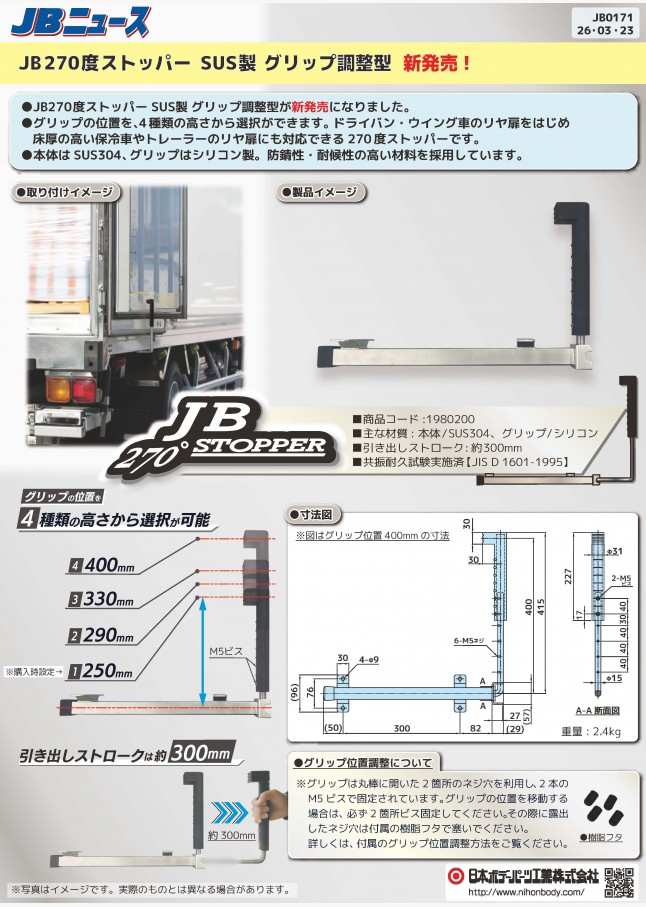 JB270度ストッパー SUS製 グリップ調整型が新発売になりました。グリップの位置を4種類の高さから選択ができます。ドライバン・ウイング車のリヤ扉をはじめ床厚の高い保冷車やトレーラーのリヤ扉にも対応できる270度ストッパーです。