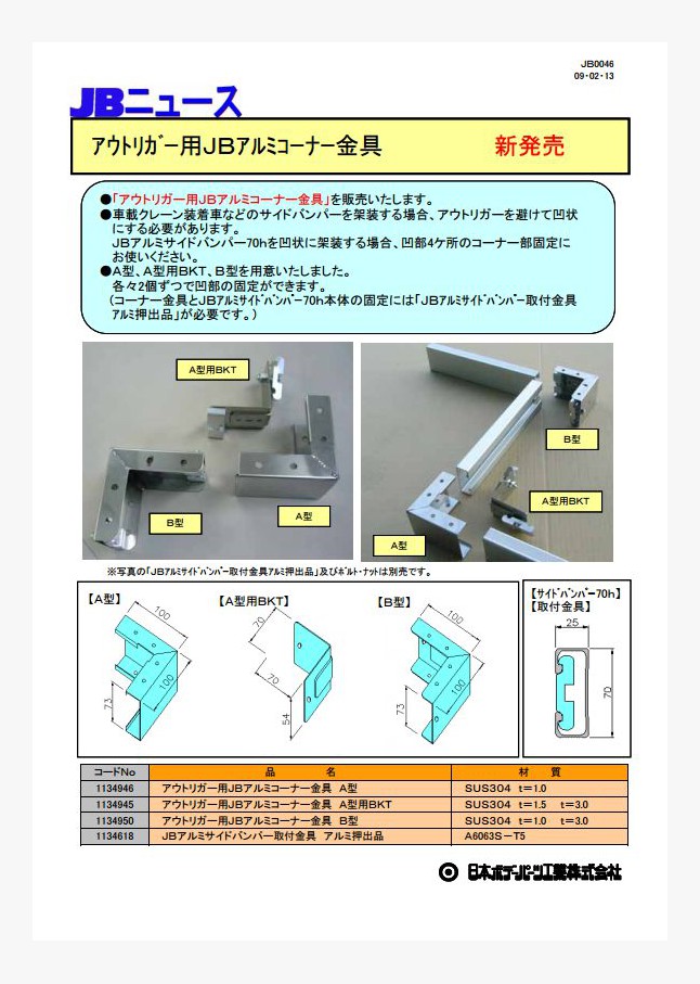 「アウトリガー用JBアルミコーナー金具」を販売いたします。