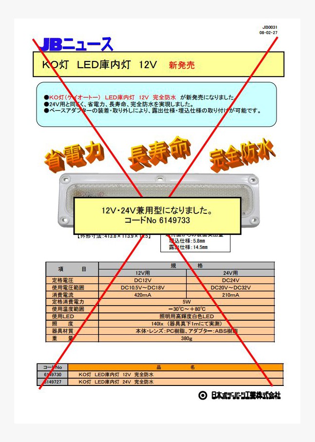 JB看板灯 アルミ製のLED/アクリルレンズ仕様が新発売になりました。24V自動車専用で大・小 2種類のラインナップ。LED化により省電力・水銀フリーを実現。環境に配慮した看板灯です。