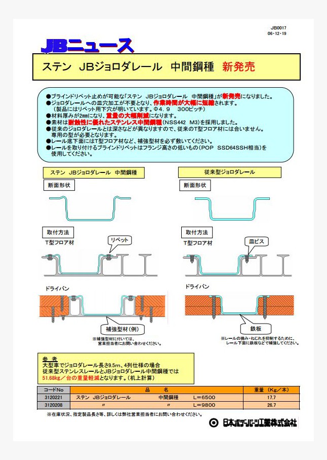 ブラインドリベット止めが可能な「ステン JBジョロダレール 中間鋼種」が新発売になりました。