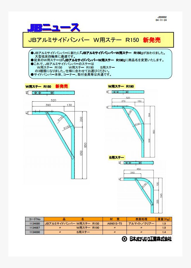 JBアルミサイドバンパーに新たに「JBアルミサイドバンパーW用ステー R150」が加わりました。