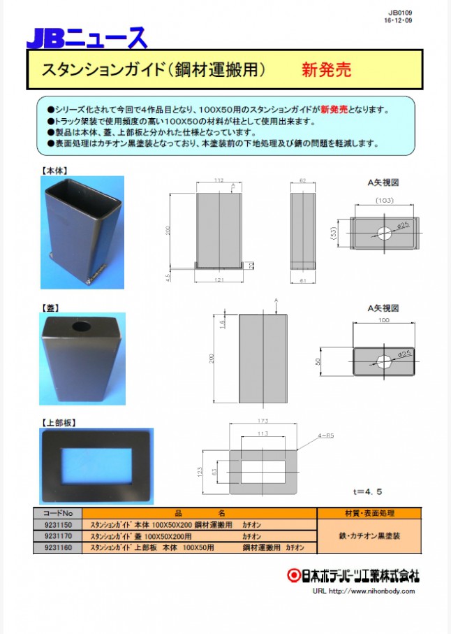 100×50用のスタンションガイドが新発売となりました。製品は本体、蓋、上部板に分かれた仕様です。表面処理はカチオン黒塗装。