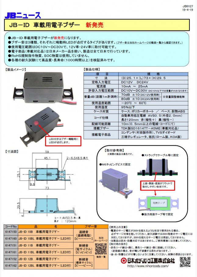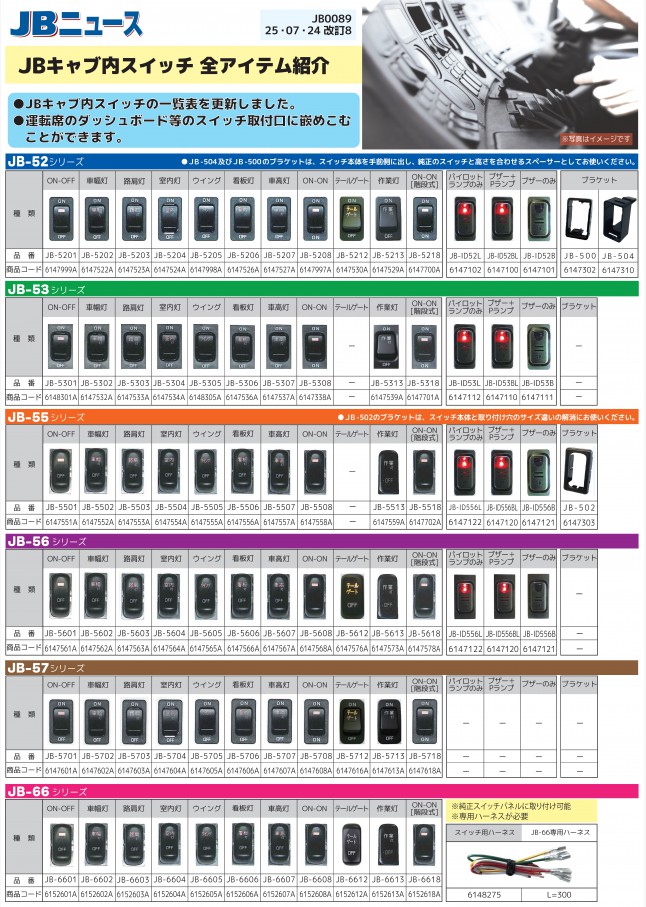 JB0089 JBキャブ内スイッチの一覧を更新しました。2017年モデルチェンジ車の取付可能位置についてはQRコードから確認ができます。