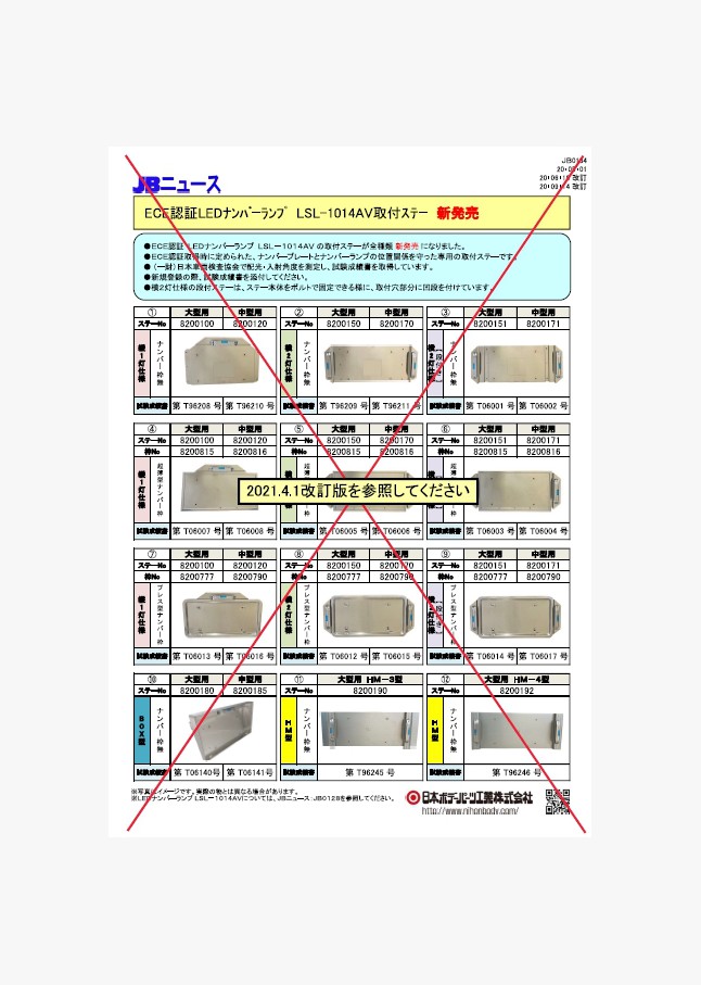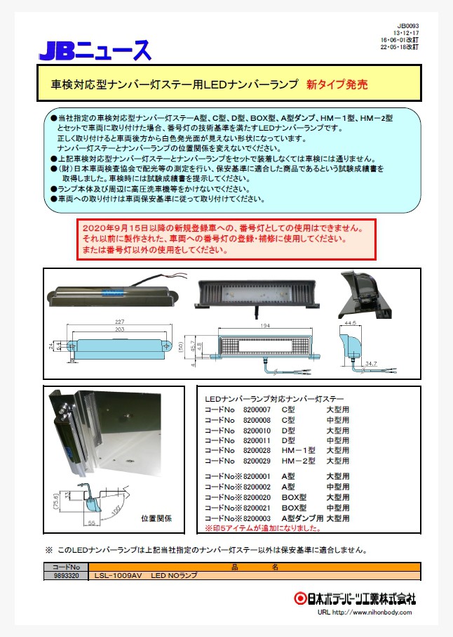 車検対応型No灯ステーA型大型用、A型中型用、BOX型大型用、BOX型中型用、A型ダンプ用大型用 がLEDナンバー灯(LSL-1009AV)に対応するようになりました。(旧基準対応品の為、2020年9月15日以降の新規登録車への、番号灯としての使用はできません。)