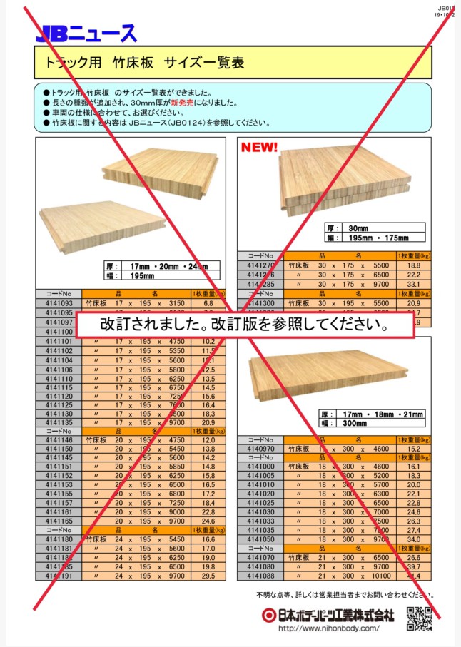 トラック用竹床板のサイズ一覧表です。アイテムの増減に伴い、竹床板のアイテムリストを更新しました。