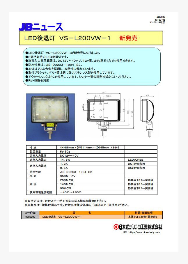LED後退灯VS-L200VW-1が新発売になりました。