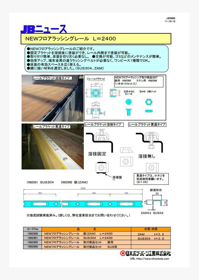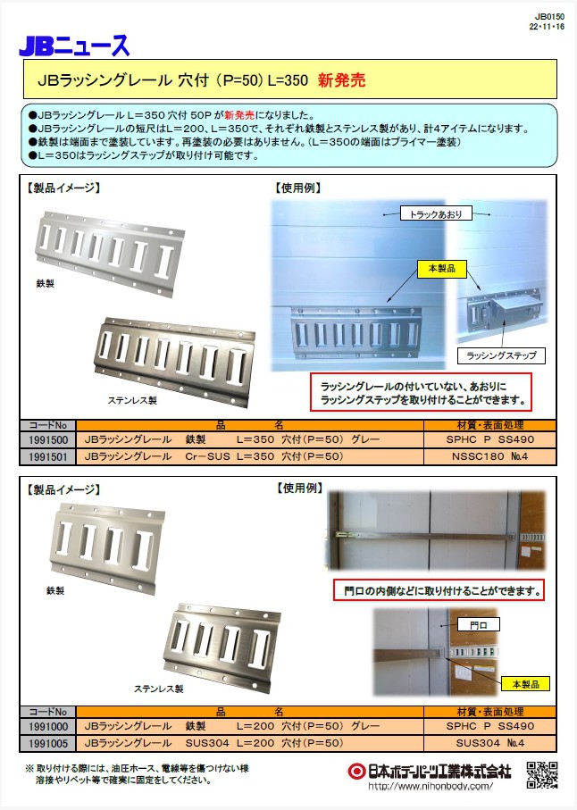 JBラッシングレールの短尺サイズL=350の鉄製・ステンレス製が新発売になりました。ラッシングレールの付いていないあおりに、ラッシングステップを取り付けることができます。既存のL=200と合わせて計4アイテムになります。