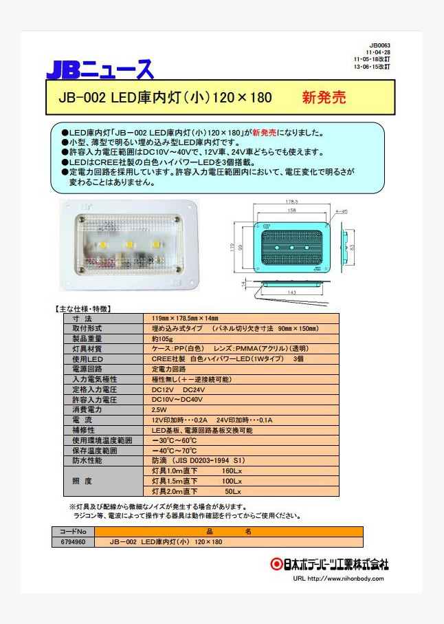 LED庫内灯「JB-002 LED庫内灯(小)120×180」が新発売になりました。