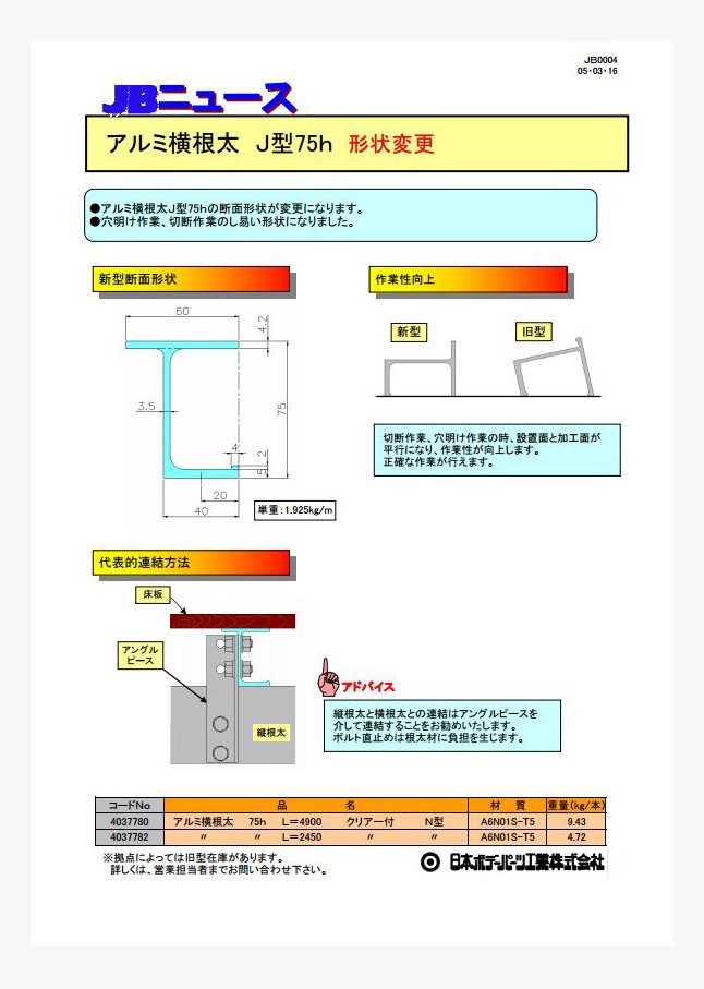 アルミ横根太J型75hの断面形状が変更になります。