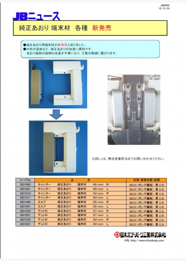 純正あおり用端末材を新発売しました。中柱の追加など「純正あおりの改造」に便利です。あおり端部の面倒な改造が不要になり工数削減が可能です。