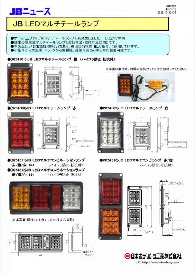 オールLEDタイプのマルチテールランプを新発売しました。DC24V専用、ECE認証取得品、環境負荷物質ELV指令適応。従来の電球タイプと寸法的に互換性あります。小型車から大型車、トラックから農耕機、建築車両などあらゆる車に装着可能です。