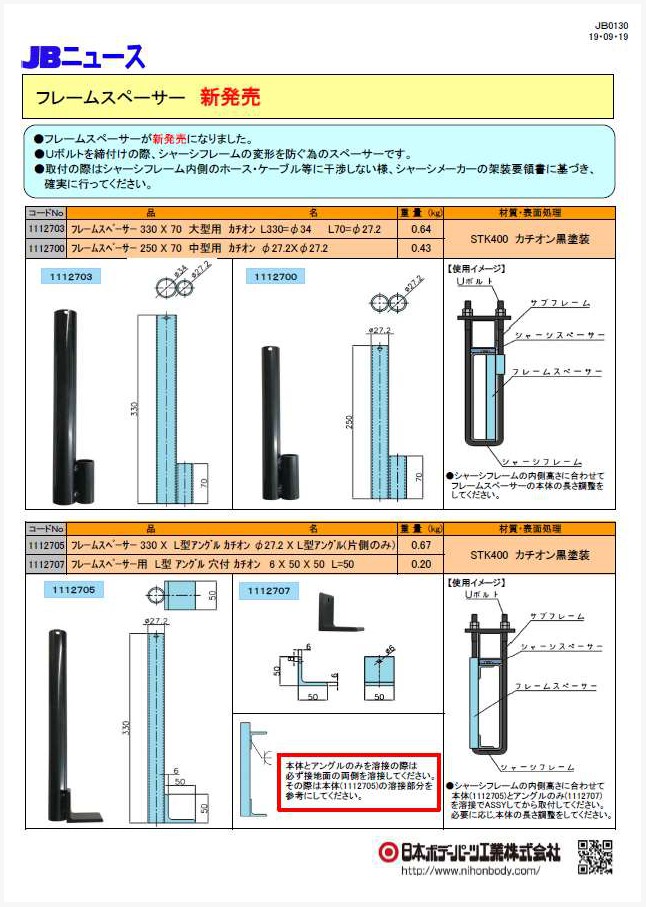 JBアルミサイドバンパー100H用のエンドキャップとショートコーナーが新発売になりました。サイドバンパー分断箇所の安全対策としてご使用ください。ショートコーナーはJABIA/自動車車体規格のサイドバンパー分断箇所に適合する設計です。