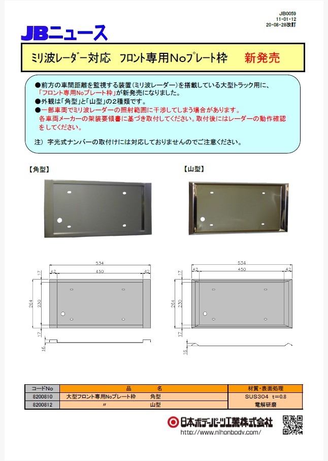 前方の車間距離を監視する装置(ミリ波レーダー)を搭載している大型トラック用に、「フロント専用Noプレート枠」が新発売になりました。