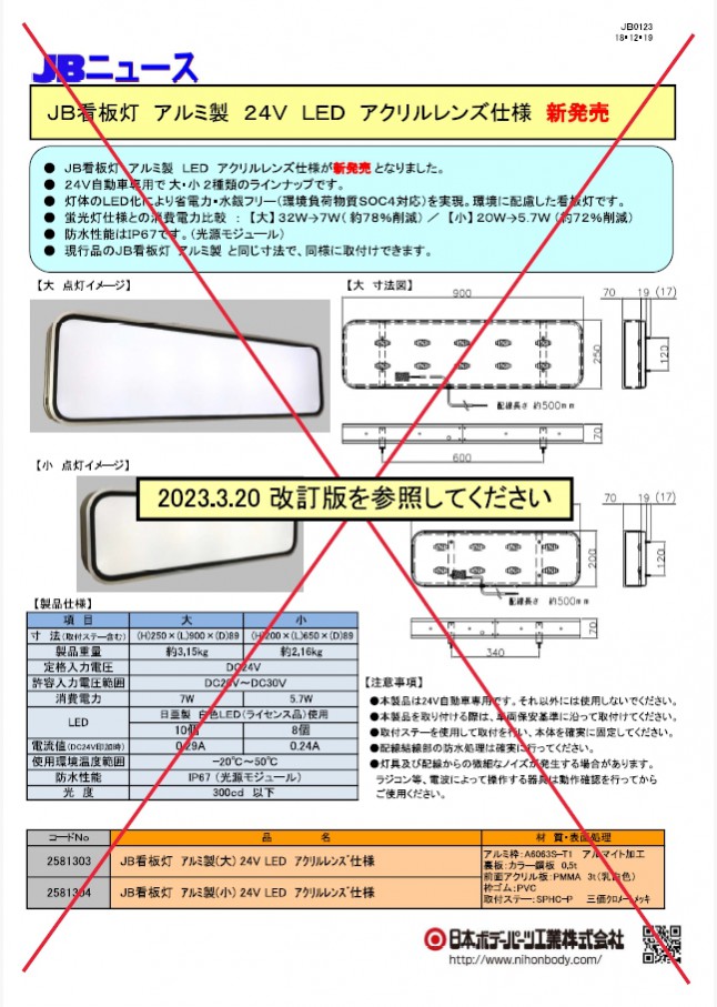 JB看板灯 アルミ製のLED/アクリルレンズ仕様が新発売になりました。24V自動車専用で大・小 2種類のラインナップ。LED化により省電力・水銀フリーを実現。環境に配慮した看板灯です。