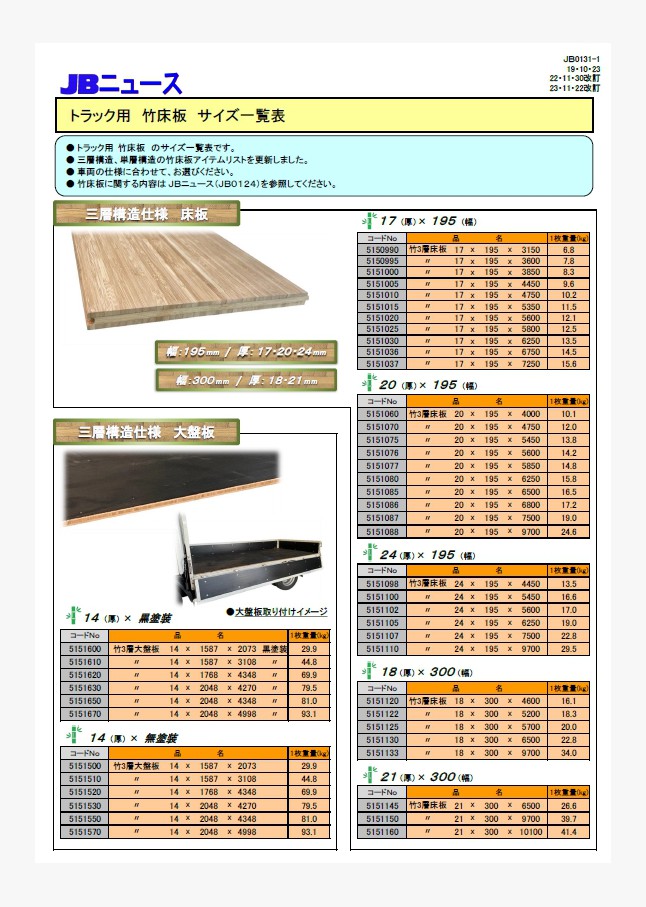トラック用竹床板のサイズ一覧表です。アイテムの増減に伴い、竹床板のアイテムリストを更新しました。