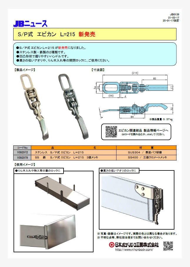JB ステンレス バン扉蝶番 リヤー用・サイド用が仕様変更し、販売再開になります。リヤー用は大・小の2種類が入荷済、サイド用は2019年4月頃の発売予定です。