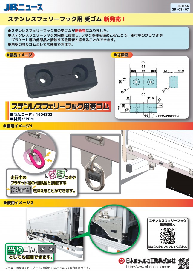 ステンレスフェリーフック用の受ゴムが新発売になりました。フック本体を嵌めこむことで走行中のグラつきやブラケット等の他部品と接触する金属音を抑えることができます。また角型の当りゴムとしても使用できます。