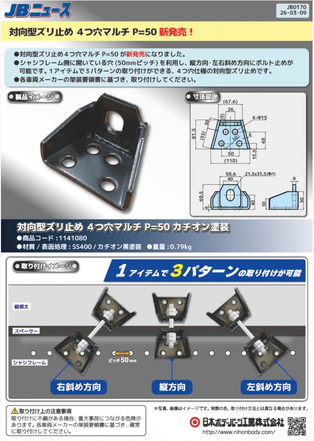 対向型ズリ止め4つ穴マルチ P=50が新発売になりました。シャシフレーム側に開いている穴(50mmピッチ)を利用し、縦方向・左右斜め方向にボルト止めが可能な4つ穴仕様の対向型ズリ止めです。